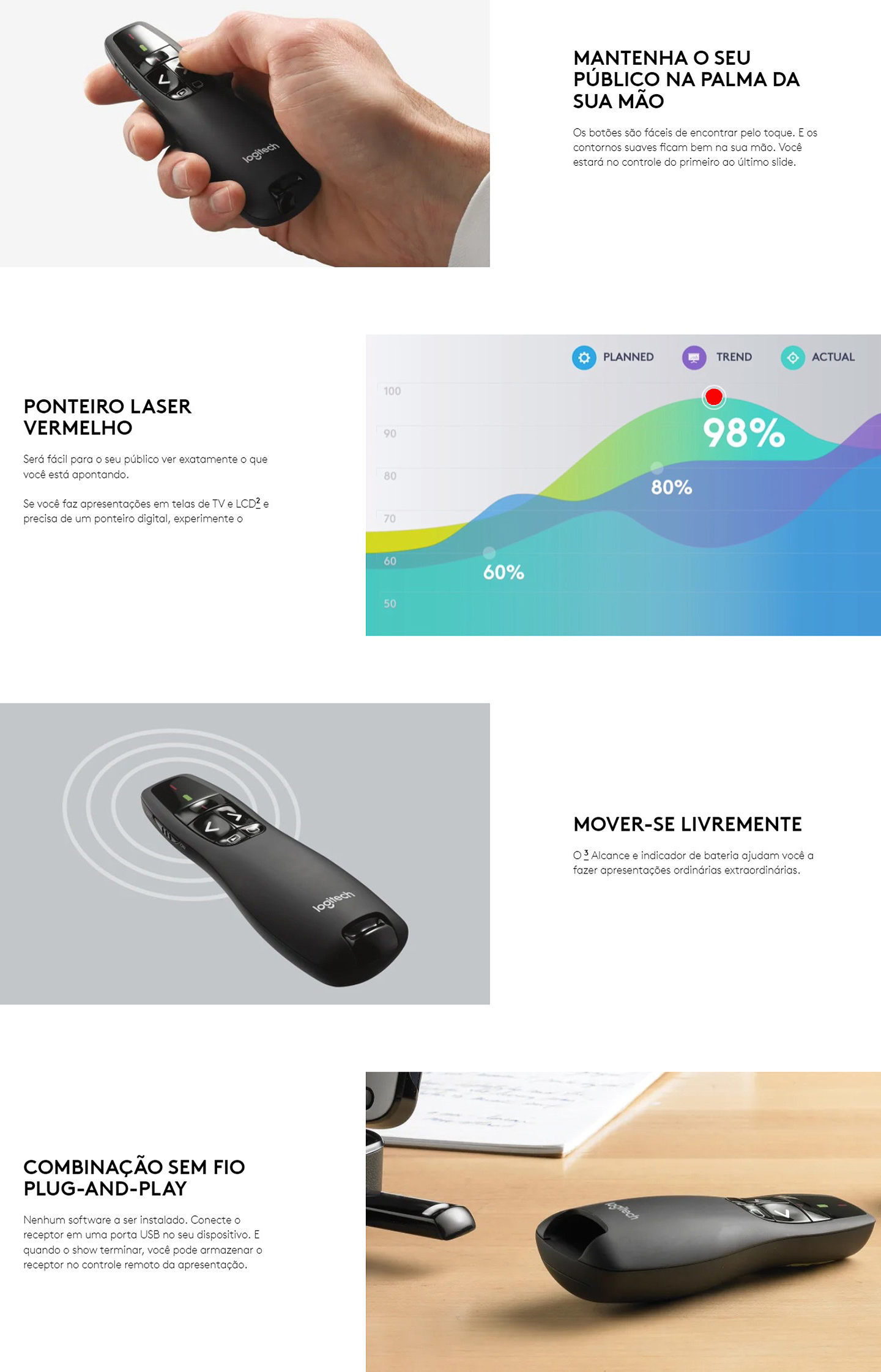 O Logitech Wireless Presenter R400 foi projetado para ajudá-lo a se destacar. Os botões são localizados facilmente por toque. E os contornos suaves dão uma sensação agradável. Você estará no controle do primeiro ao último slide. Os controles intuitivos e o ponteiro a laser vermelho tornam as apresentações facílimas, mesmo nos auditórios mais escuros. A mobilidade sem fios permite que você desfrute de liberdade para se movimentar no ambiente e se misturar com o público para criar um maior impacto. O alcance de quinze metros e o indicador de energia das pilhas ajudam você a tornar apresentações comuns extraordinárias. Não é necessário software, basta conectar o receptor a uma porta USB e você está pronto para começar. Caso haja no título do produto o termo "Sob Encomenda", considerar prazo aproximado de 15 a 45 dias úteis.