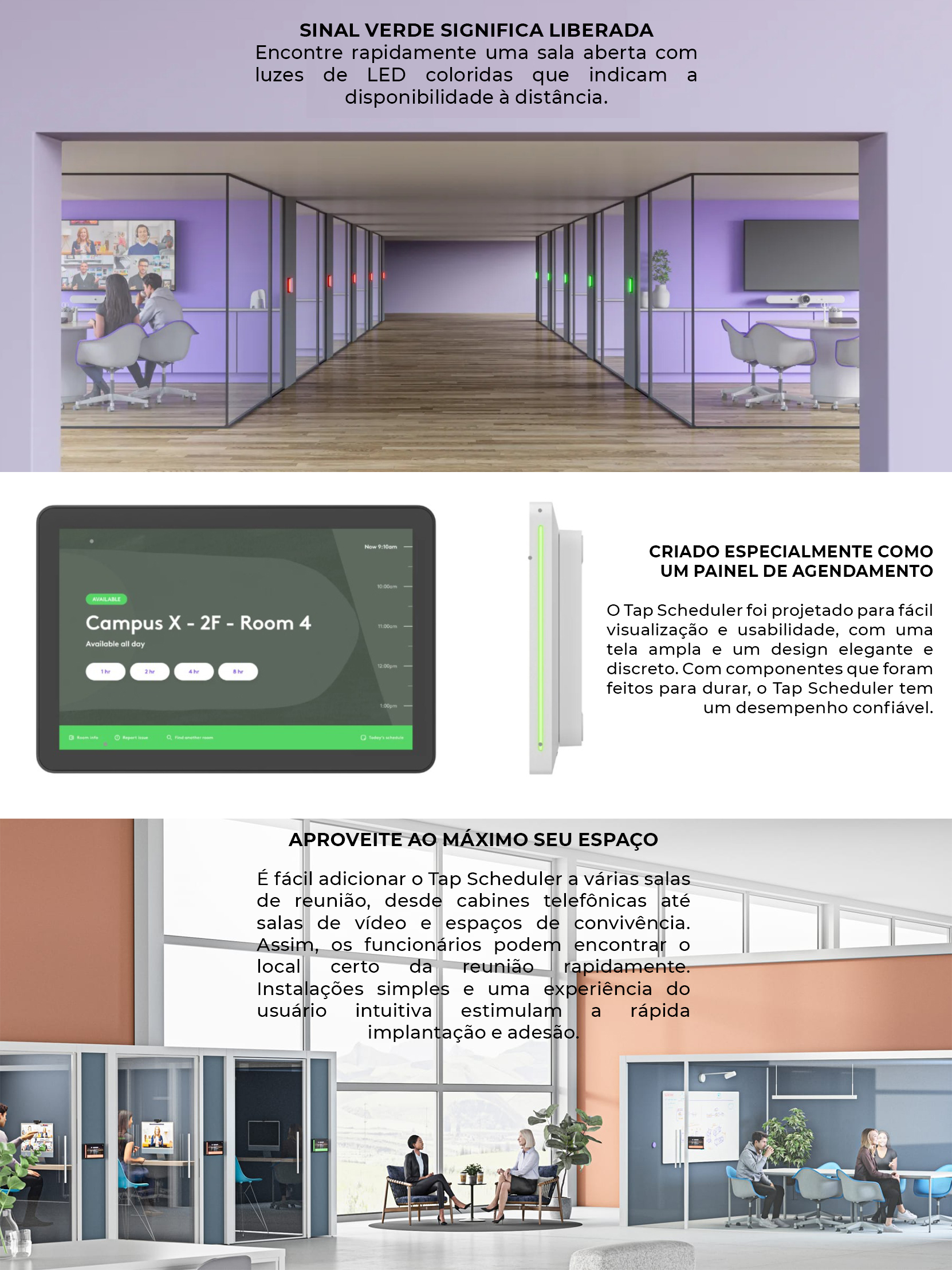 Com o Tap Scheduler, é fácil ver os detalhes da reunião e reservar uma sala para reuniões futuras ou de última hora. Ele pode ser facilmente implantado como um painel de agendamento dedicado para as principais soluções de agendamento de sala. Assim, fica mais simples para os funcionários encontrar e solicitar o espaço certo.