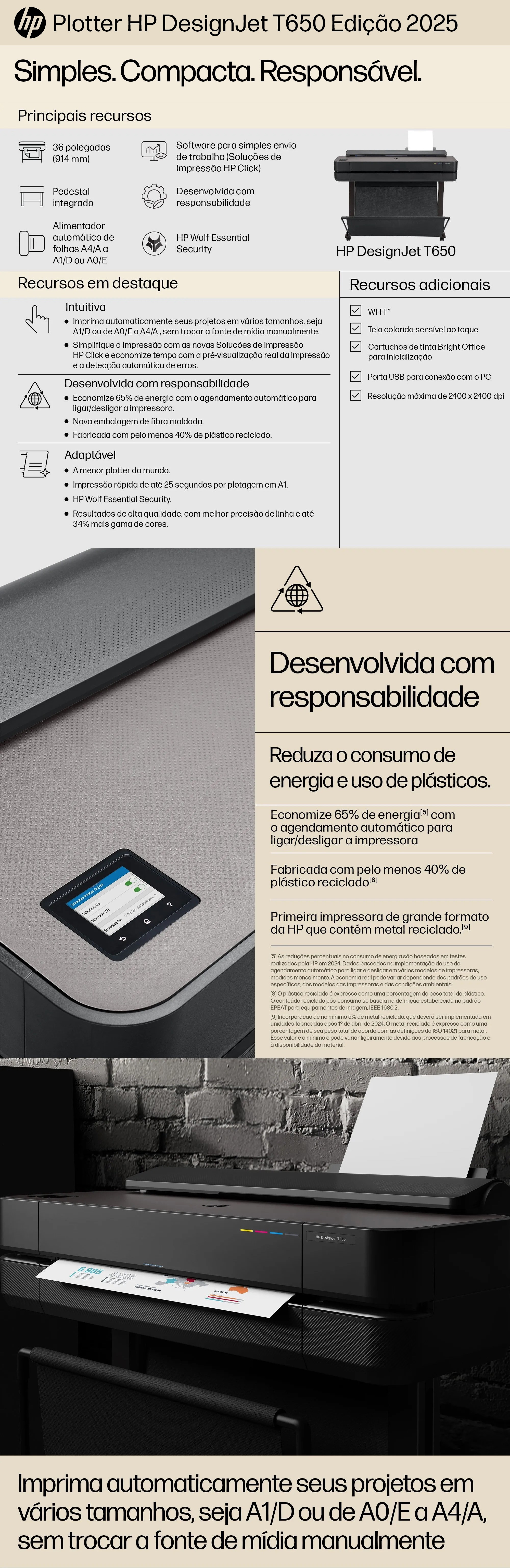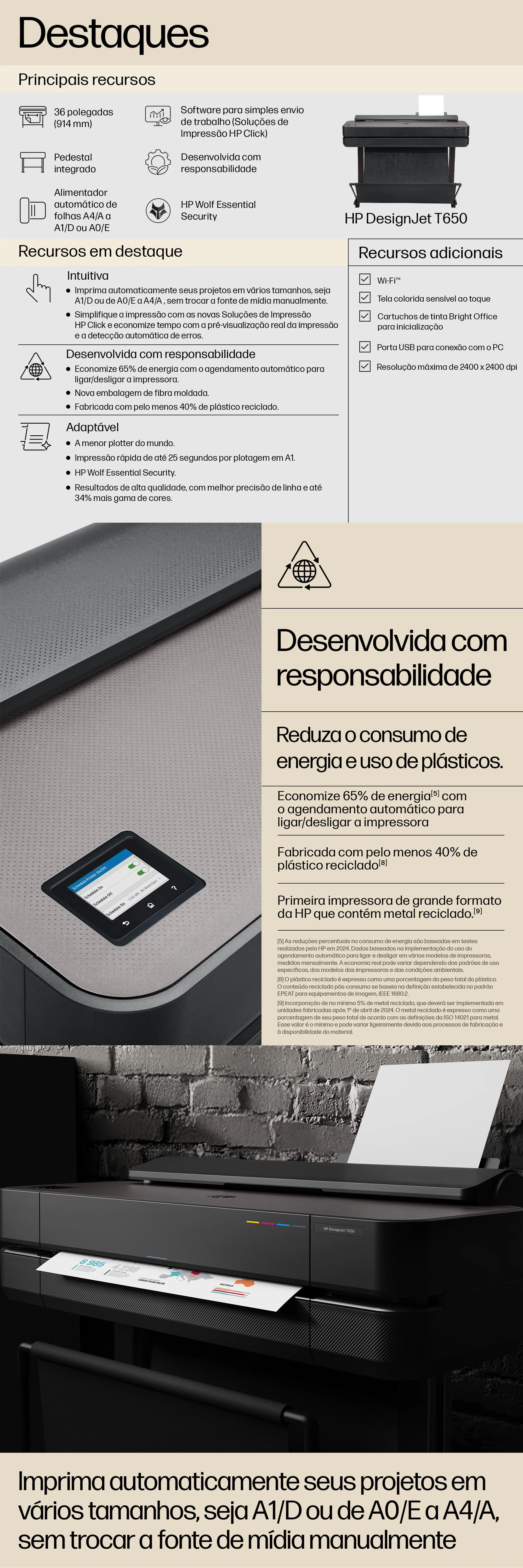 Impressora Plotter HP DesignJet T650 ECOSpark, 36", Jato de Tinta, Colorida, A0, Wi-fi, Bivolt - 5HB10D#C4 - Edição 2025