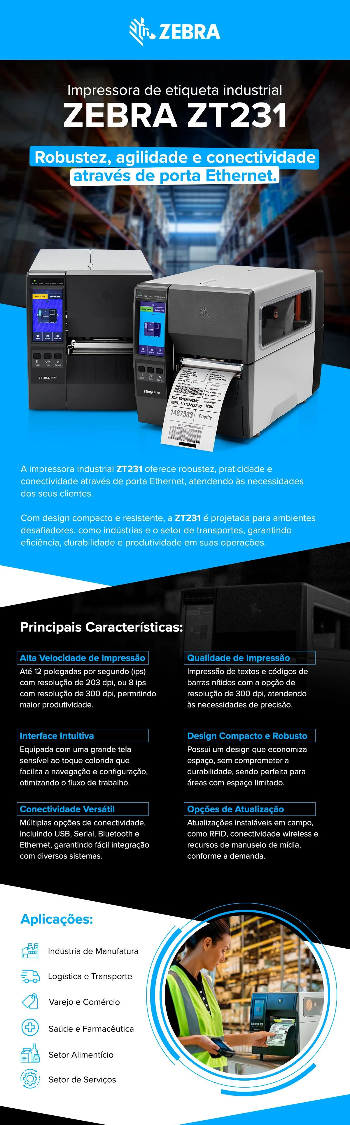 Impressora Térmica de Etiquetas Zebra ZT231, 203dpi, USB, Serial, Bluetooth, Ethernet - ZT23142-T0A000FZ
