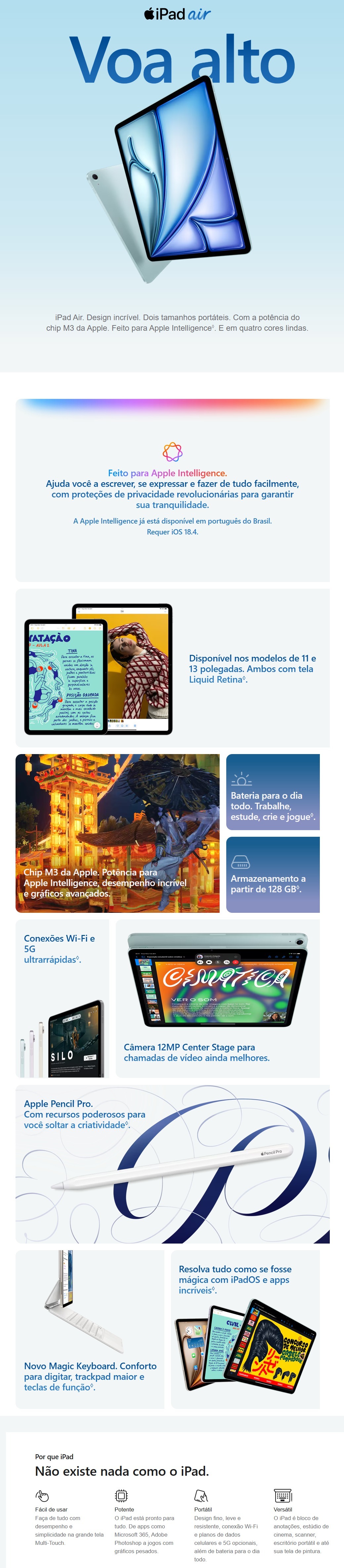 | Acessórios Compatíveis | Apple Pencil (USB-C), Magic Keyboard, Smart Keyboard Folio |