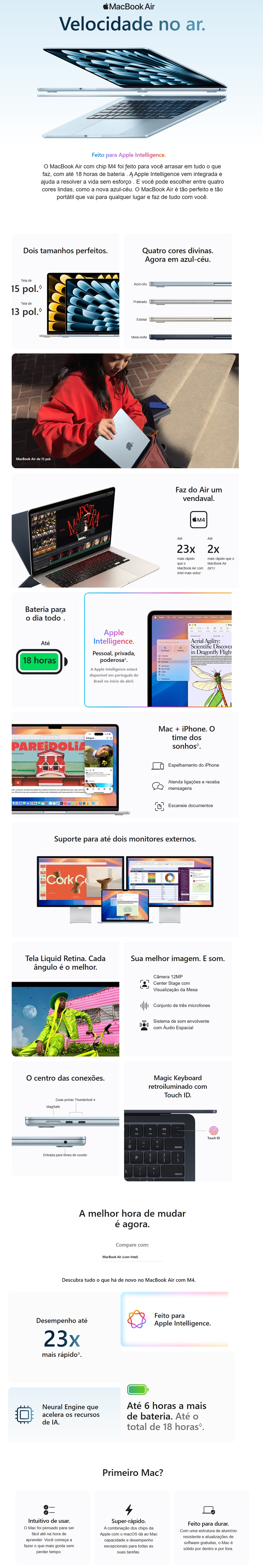 Com 16GB de memória unificada e 512GB SSD, garante velocidade e fluidez no uso diário. Sua tela Liquid Retina de 15,3" oferece brilho de 500 nits, cores P3 e True Tone para máxima fidelidade visual.