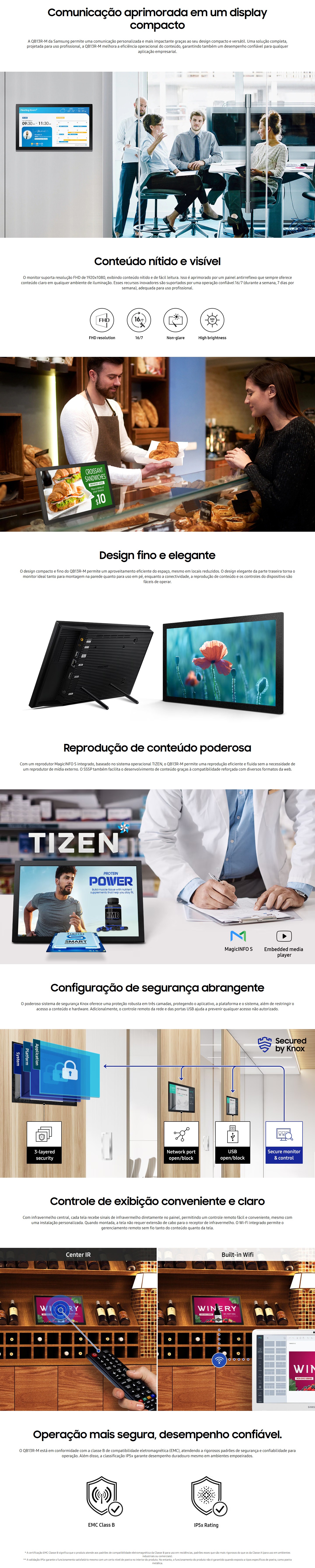 Monitor Profissional Samsung LED 13" QB13R-M Full HD, Touchscreen, Tizen, 16/7, 500 cd/m², HDMI/USB/RS232C/RJ45/Áudio - LH13QBRMBGCXZA