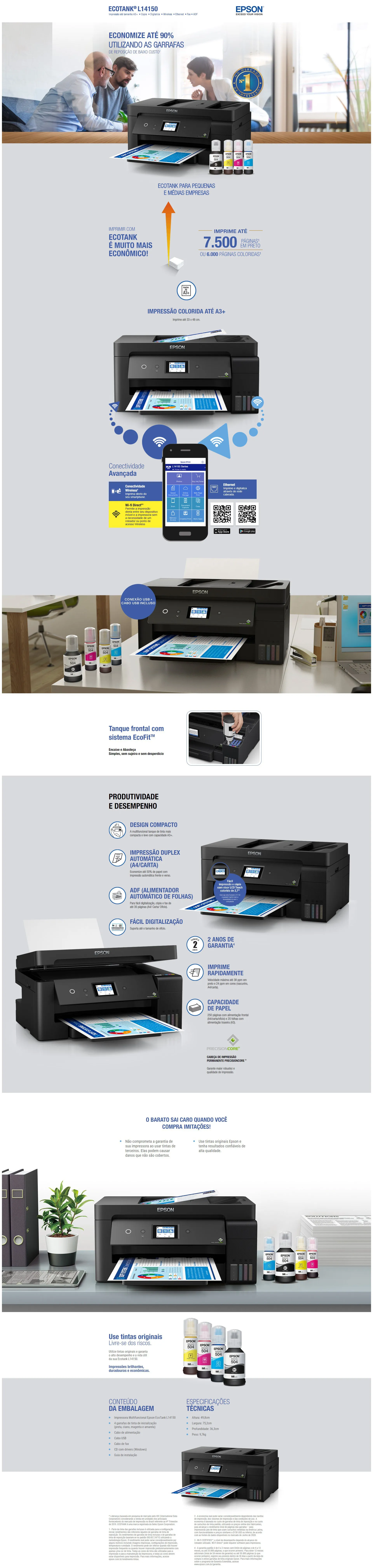 Tinta: Esta EcoTank® L14150 foi projetada para uso exclusivo com as garrafas de tinta originais Epson. A Epson recomenda o uso de tintas originais para garantir o melhor desempenho e qualidade de impressão, sem arriscar a garantia limitada