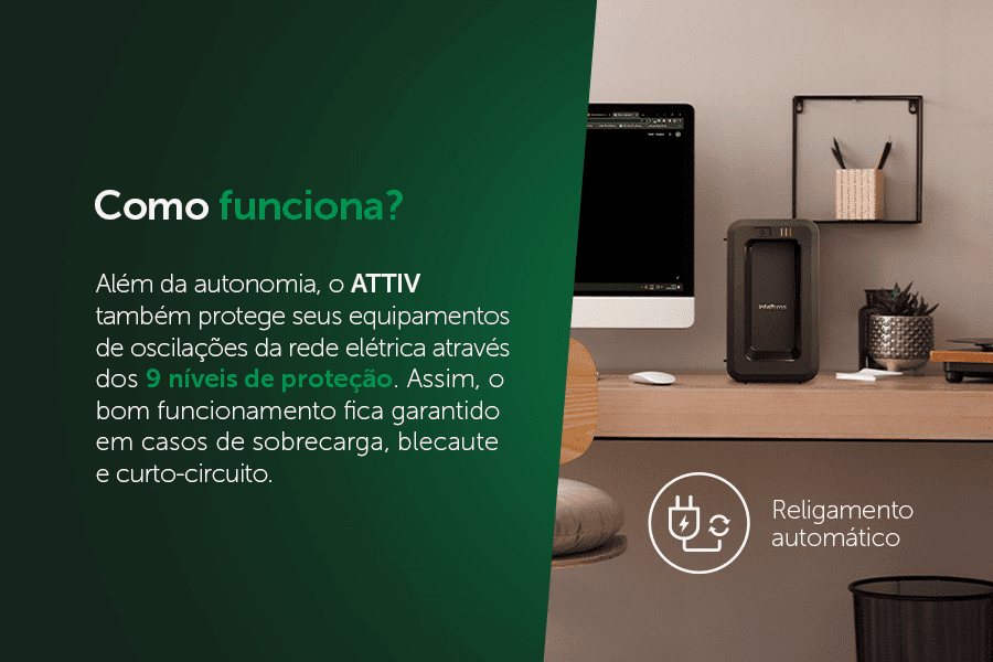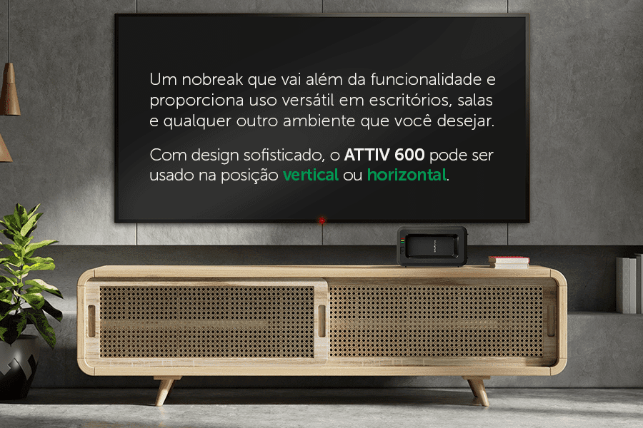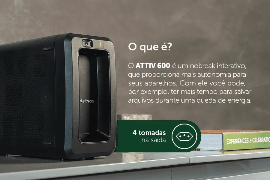 A linha de nobreaks ATTIV possui design diferenciado e versátil, pois permite uso na horizontal ou vertical. Foi desenvolvida para proteção de equipamentos de informática, áudio e vídeo, segurança e eletrônicos em geral, como: PABX, centrais condominiais, roteadores, switches, câmeras de CFTV, DVRs, televisores, impressoras, microcomputadores, consoles e videogames, dentre outros.