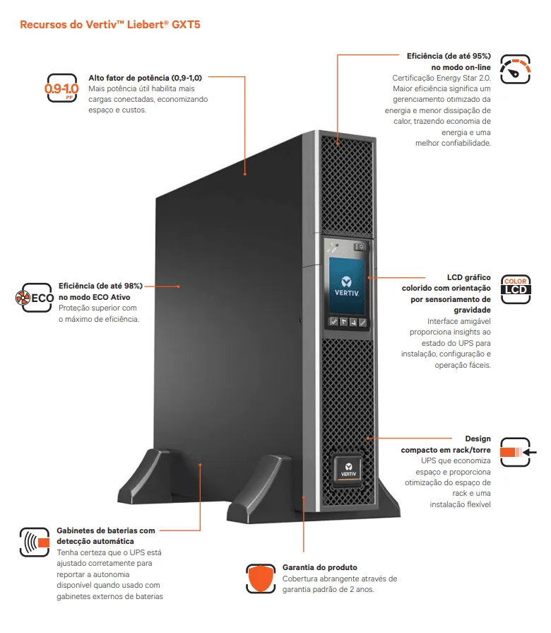 O UPS Liebert GXT5 monofásico opera com uma alta eficiência energética, tornando-o ideal para proteger a infraestrutura crítica tanto em aplicações centralizadas como de edge.