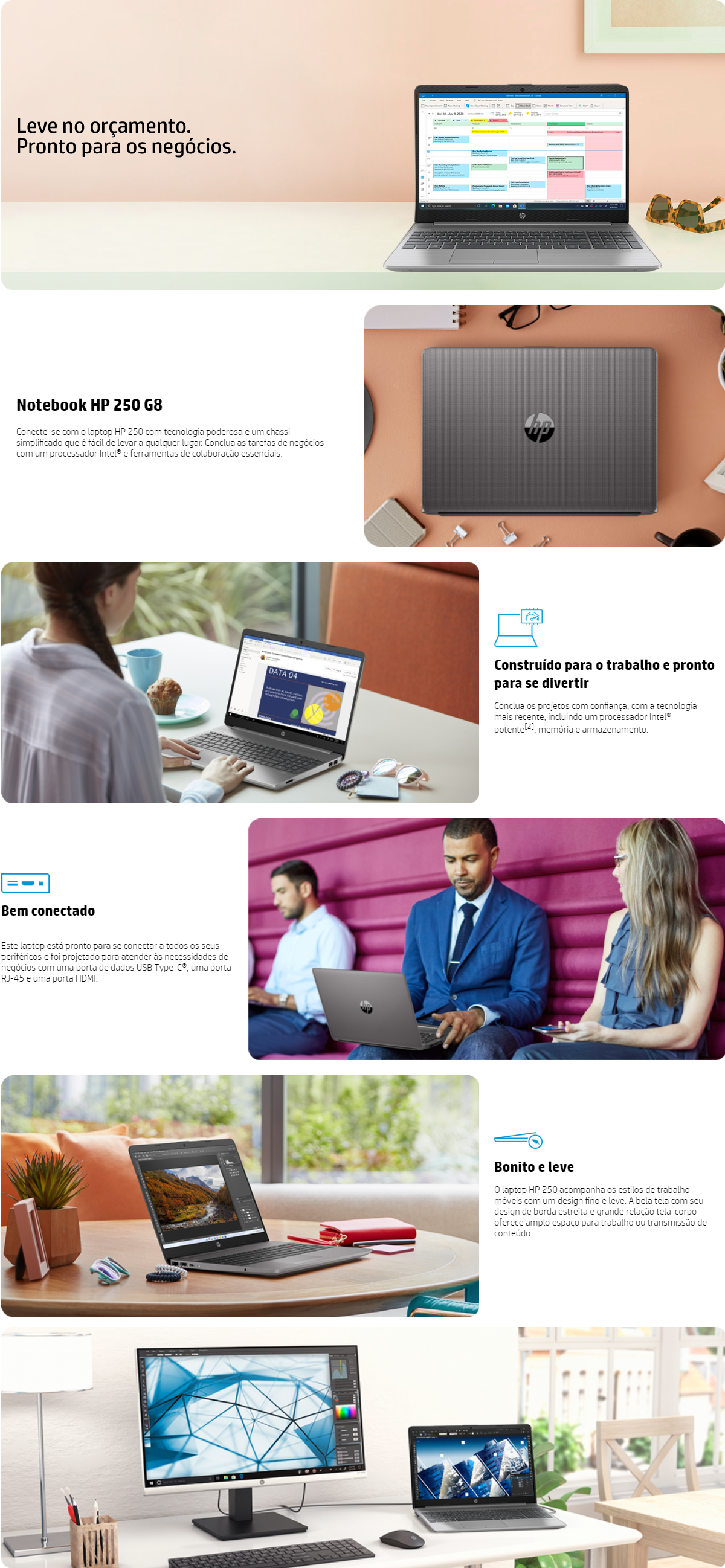 O laptop HP 250 acompanha os estilos de trabalho m?veis com um design fino e leve. A bela tela com seu design de borda estreita e grande rela??o tela-corpo oferece amplo espa?o para trabalho ou transmiss?o de conte?do.