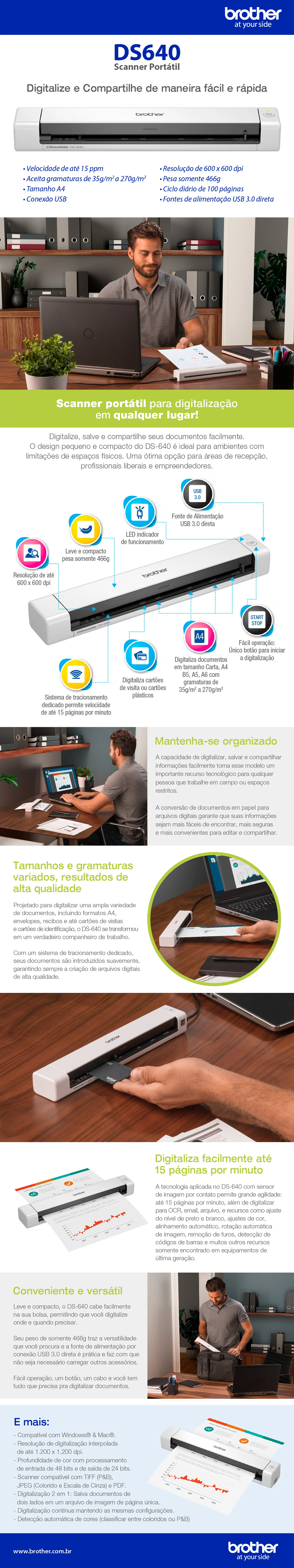 | Descrição | Scanner Brother Portátil DS640 A4 USB 15 ppm - DS640 |