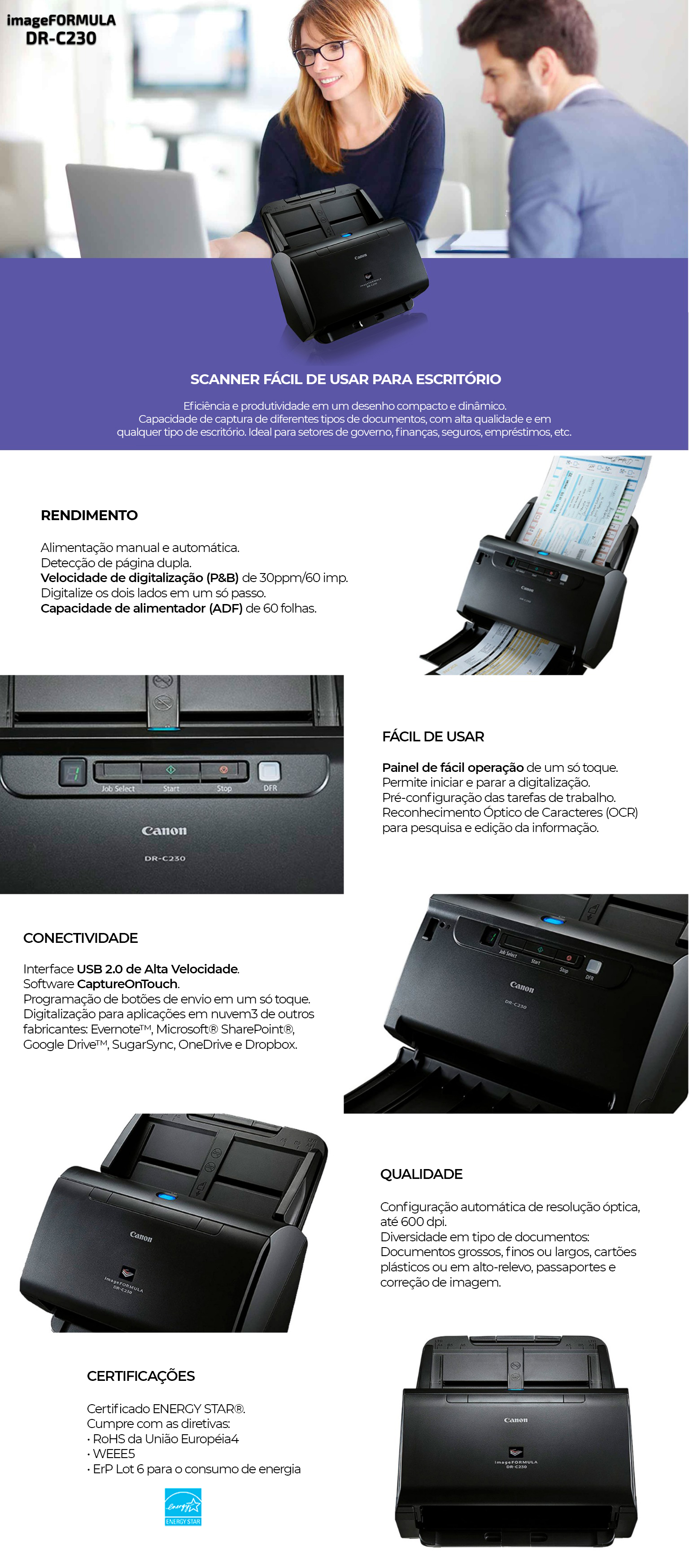 Estatura pequena, grande performance - o imageFORMULA DR-C230 oferece confiabilidade e produtividade suprema, a um preço acessível. Eficiência e produtividade em um desenho compacto e dinâmico.