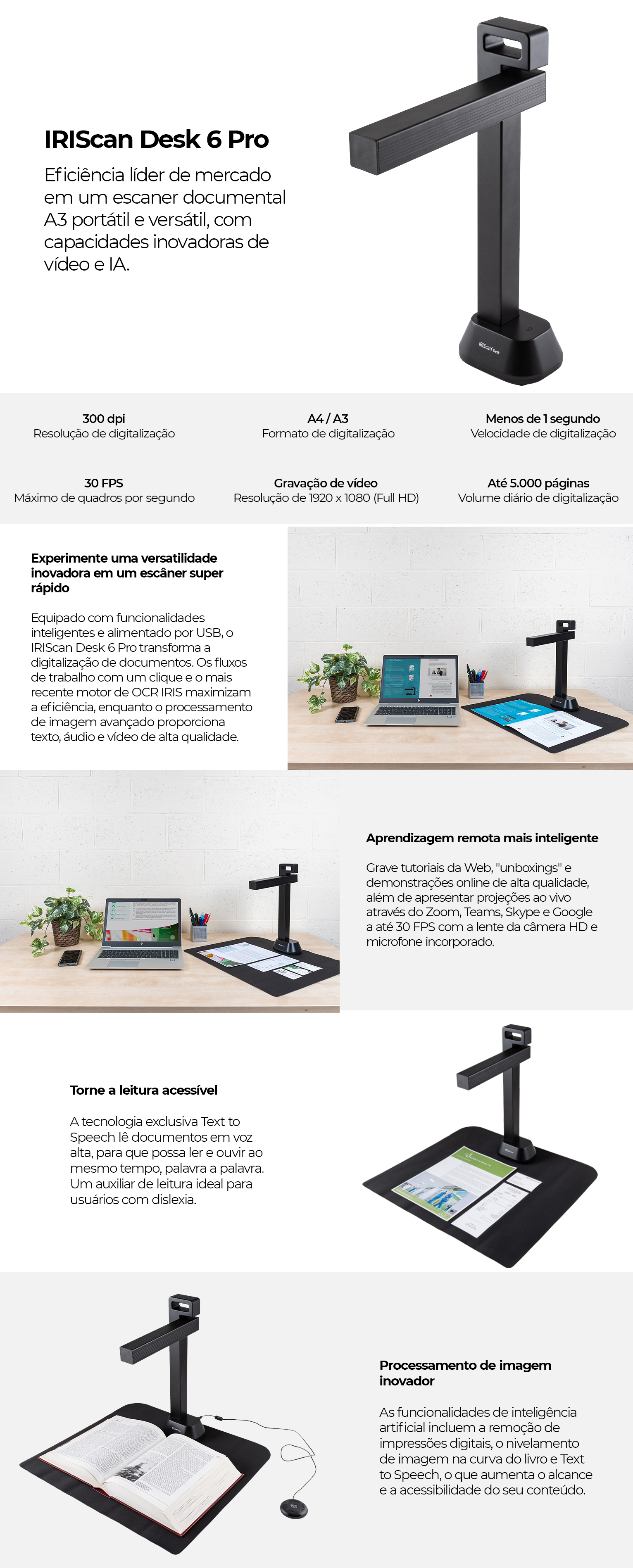 O IRIScanT Desk 6 Pro é um scanner de documentos profissional e versátil e um assistente para sessões de ensino à distância.