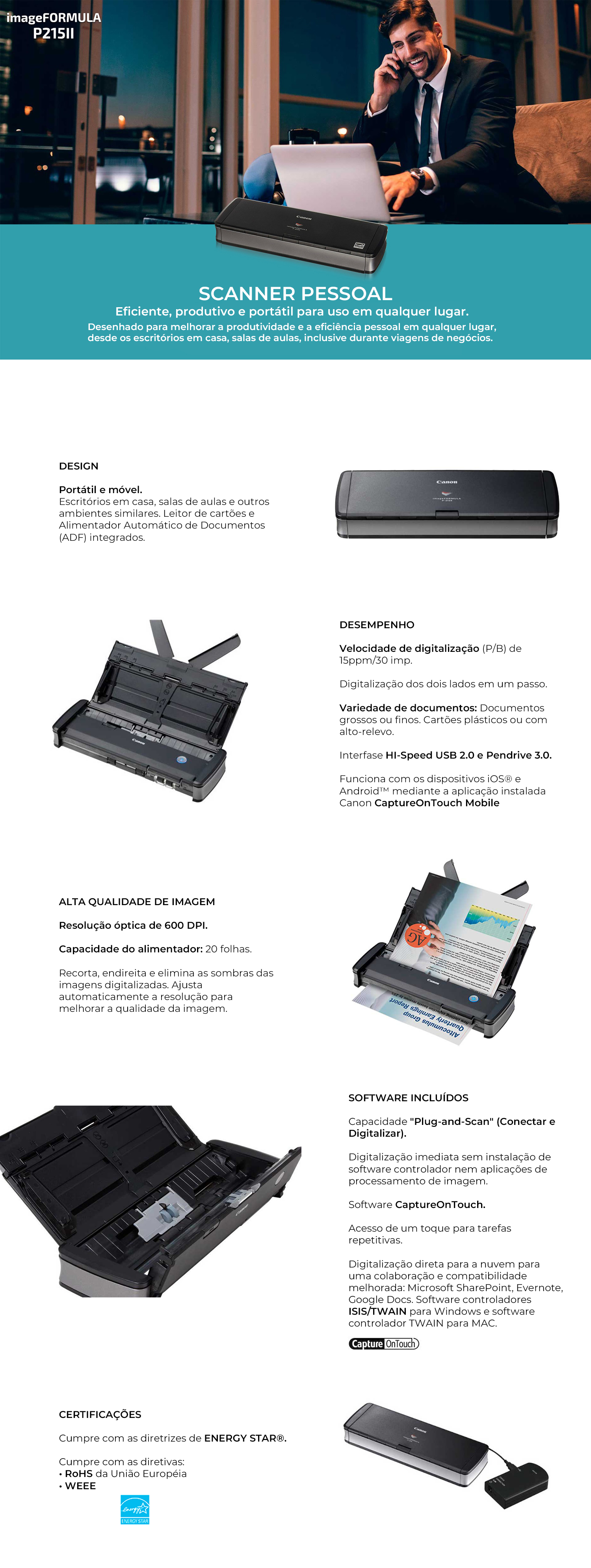 | Pacote de Software para Windows | ISIS/TWAIN Drivers, Canon CaptureOnTouch and CaptureOnTouch Lite (embutido), Evernote, NewSoft Presto! Bizcard, Nuance PaperPort |